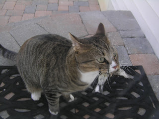 Winston brought me a little something this morning. I took this photo through the door. Poor little guy. You can’t see in the photo but he was beautiful, had a bright yellow stripe on him. And no, he was not let in the house with my “gift”! Of course, my husband would have said, “Good kitty.” Sigh.